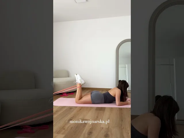 Połóż się na brzuchu i zaczep gumę o kostki.