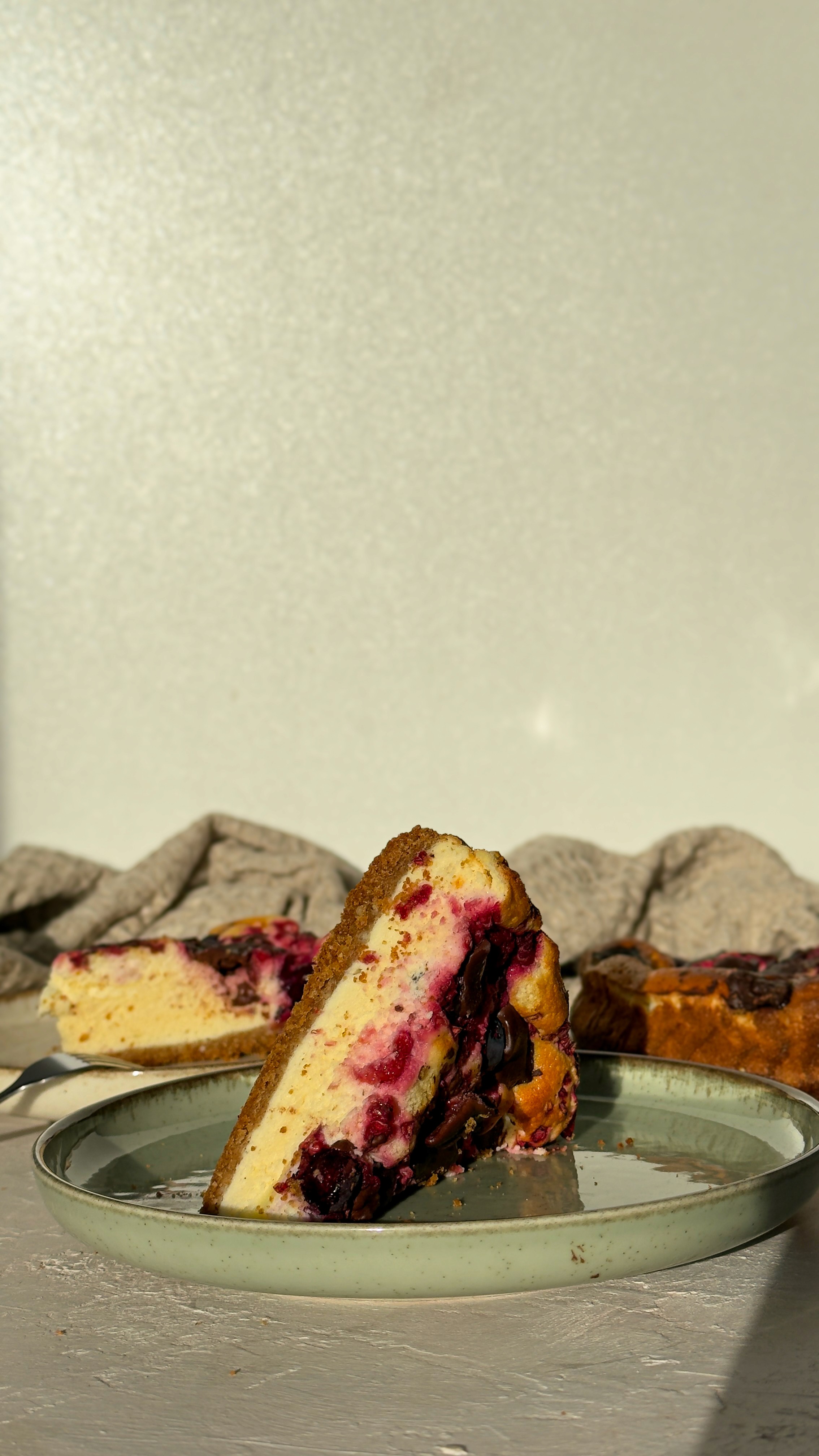 Masę wylej na ciasteczkowy spód, posyp kawałkami czekolady i owocami. Piecz 30-35 minut w 180°C.